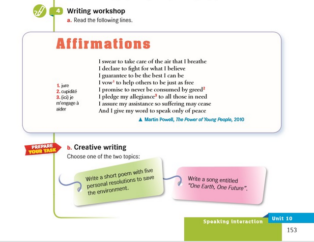"Global Warning" and "Affirmations" published in Meeting Point 2: Editions Hatier, France. Students will study these poems and compose their own works with "5 personal resolutions to save the world" as part of their preparations for International Earth Day. 40,000 copies nationwide.